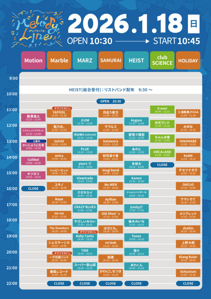 リストバンド引き換え:HEIST(総合受付)にて9:30〜